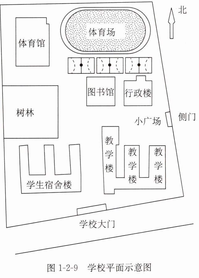 小明学校计划在本校体育馆举行一场篮球赛。图1-2-9是学校平面示意图。读图,回答4、5题。