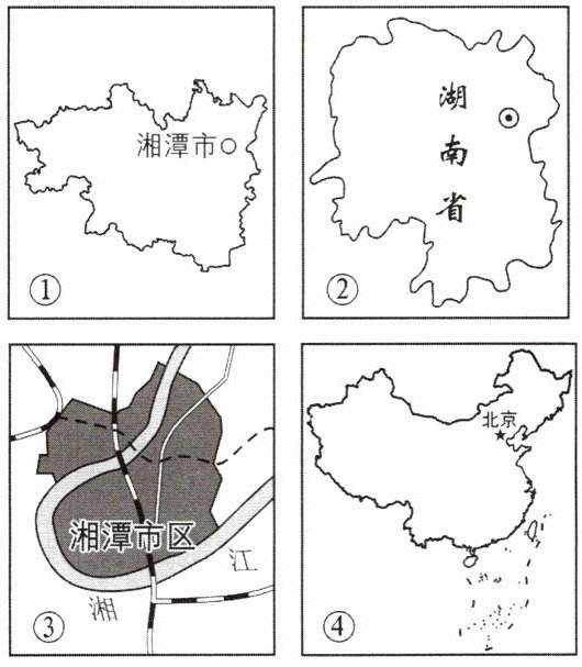 3.D 【解析】在图幅相同的情况下,比例尺越大,表示的范围越小,内容越详细;比例尺越小,表示的范围越大,内容越简略。四幅区域示意图中,按比例尺从小到大的顺序排列应是:中国地图、湖南省地图、湘潭市地图、湘潭市区地图,即④②①③。故选D。
