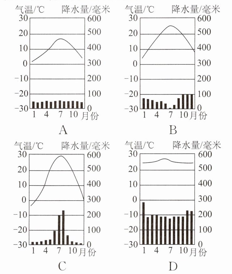7.B 【解析】由材料可知,该区域春季花开、夏季炎热多雨、秋季草木枯黄、冬季则冰天雪地,四季分明,最有可能在温带季风气候区。故选 B。8.C 【解析】由上题可知,该区域可能属于温带季风气候,该气候类型的主要特征是夏季炎热干燥,冬季寒冷干燥。故选 C。9.C 【解析】读图可知,A 是全年温和湿润的温带海洋性气候,B是夏季炎热干燥、冬季温和多雨的地中海气候,C是夏季暖热多雨、冬季寒冷干燥的温带季风气候,D是全年高温多雨的热带雨林气候。由上题可知,C 正确。故选 C。