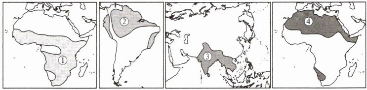 )A. ①热带雨林气候、②热带草原气候、③热带季风气候、④热带沙漠气候