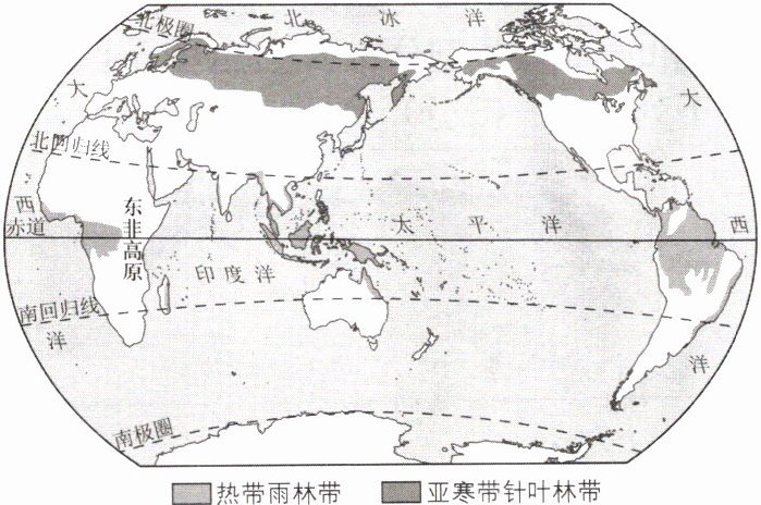 (3)从纬度位置看,亚寒带针叶林主要分布在中高纬度地区,热带雨林主要分布在