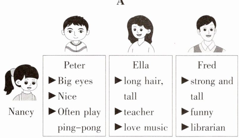 26. C [解析]根据“My mum's name is... She's tall with long hair. She's a history teacher.”可知,她的妈妈很高,留着长发,是一名历史老师。结合图片内容可知,南希的妈妈是艾拉。根据“My dad is... He's strong and tall. He works in a library”可知,她的爸爸很高、很强壮,在图书馆工作。结合图片内容可知,南希的爸爸是弗雷德。根据“My brother... is 10. He has beautiful big black eyes. He loves sports. When he is free, he likes to play ping-pong.”可知,她的弟弟有一双大眼睛,喜欢运动,喜欢打乒乓球。结合图片内容可知,南希的弟弟是彼得。