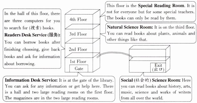 16. B [解析]根据“2nd Floor”中的“In the hall of this floor, there are three computers for you to search for books.”可知,在二楼,你能用电脑搜索书籍,二楼在咨询台服务的楼上。 17. B [解析]根据“1st Floor”中的“There is a hall and two large reading rooms on the first floor.”可知,一楼有两个大阅览室。 18. B [解析]根据“Social Science Room: Here you can read books about history, arts, music, science and works of writers from all over the world.”可知,如果戴维想读一本历史书,他可以去社会科学室。 19. C [解析]根据“4th Floor”中的“It is not for everyone but for some special teachers.”可知,学生不能在四楼看书。