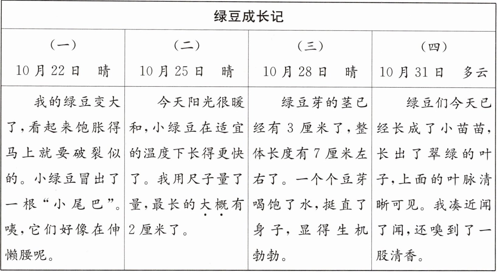 3. 作者从不同角度对绿豆的生长过程进行了细致的观察,下列观察角度在观察日记中没有涉及的一项是( )。
