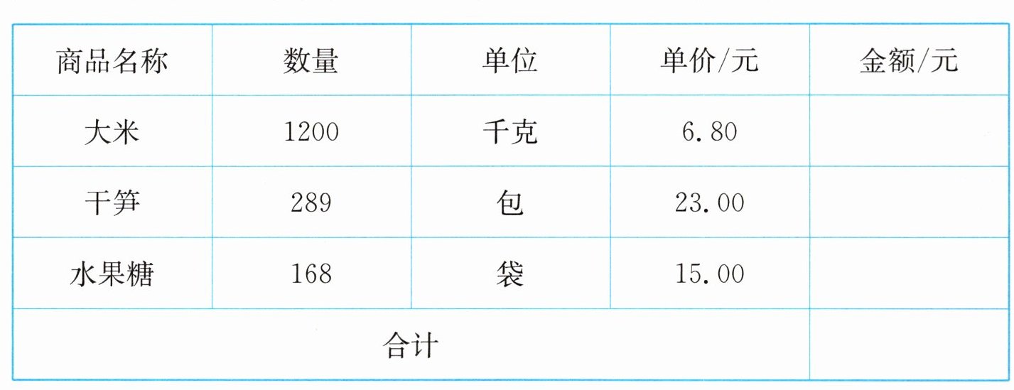 2. 下面是某超市的一份货物采购单,请你补充完整,用计算器计算。