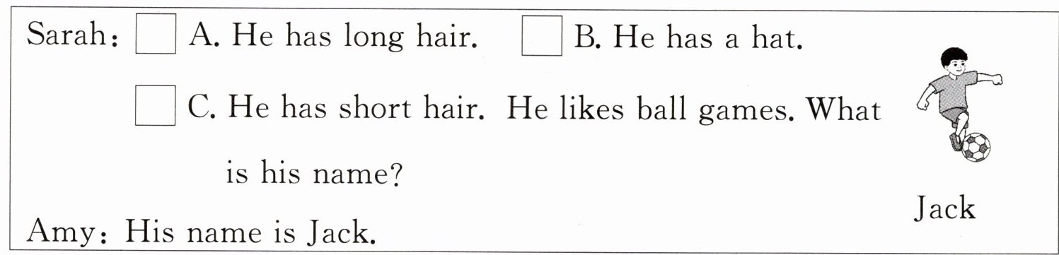 C. He has short hair. He likes ball games. What is his name?|||Amy: His name is Jack.| |