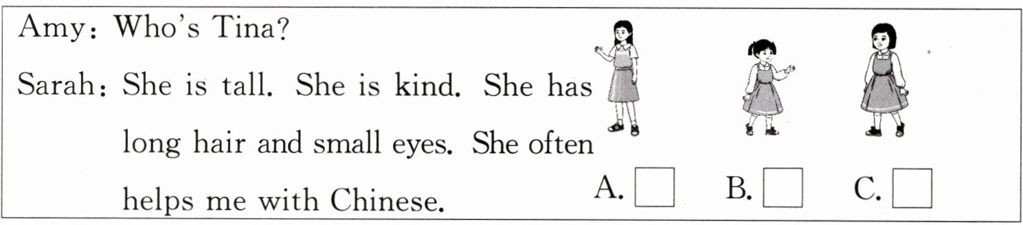 |Sarah: She is tall. She is kind. She has long hair and small eyes. She often helps me with Chinese.|A.