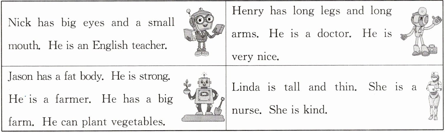 | Nick has big eyes and a small mouth. He is an English teacher. || Henry has long legs and long arms. He is a doctor. He is very nice. ||