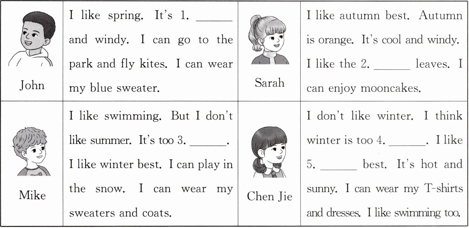 | |I like spring. It’s 1. ______ and windy. I can go to the park and fly kites. I can wear my blue sweater. | |I like autumn best. Autumn is orange. It’s cool and windy. I like the 2. ______ leaves. I can enjoy mooncakes. |