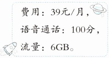 【点拨】荣老师9月份通话时长为75分,在100分以内,不需要额外加收费用。流量使用7.5 GB按8GB计算,超过6 GB的部分是8-6=2(GB),每用1 GB加收9.9元,需加收2×9.9=19.8(元),再加上月租费39元即可。