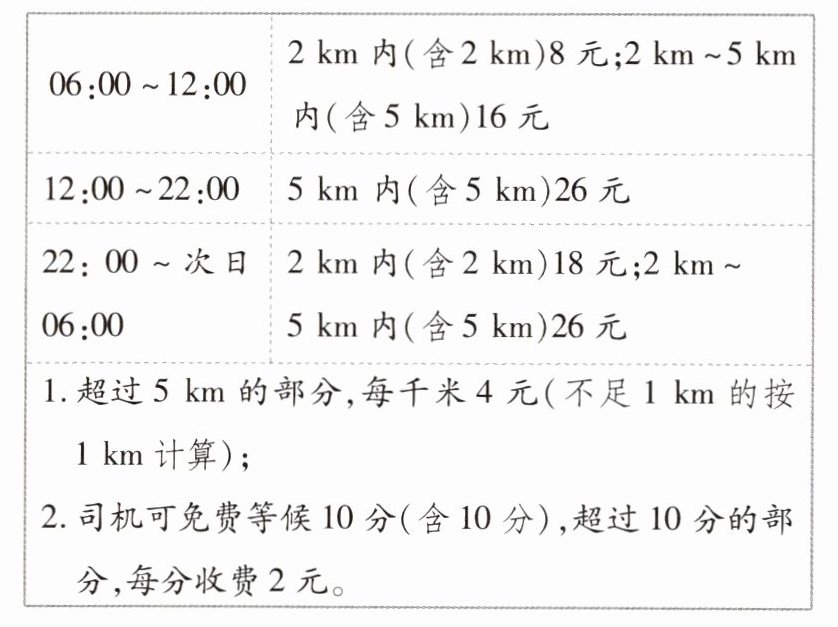 【点拨】龙龙爸爸应支付的费用包含等候时间产生的费用和行驶费用,行驶费用按距离分段计费。