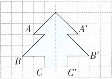 (1)如图,点A和点$A'$到对称轴的距离都是( )个小格,点B和点$B'$到对称轴的距离都是( )个小格,点C的对应点是点( )。