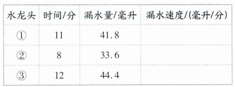 4. 新题型说理题 “节水小分队”发现学校有几个漏水的水龙头,他们对漏水情况进行了调查。请你完成表格并回答问题。