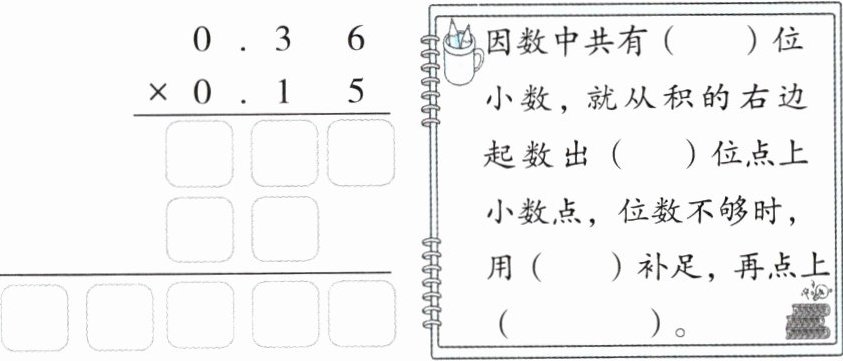 [点拨]0.36是两位小数,0.15也是两位小数,2+2=4(位),则0.36×0.15的积是四位小数,小数位数不够,要在前面用0补足位数,再点上小数点。