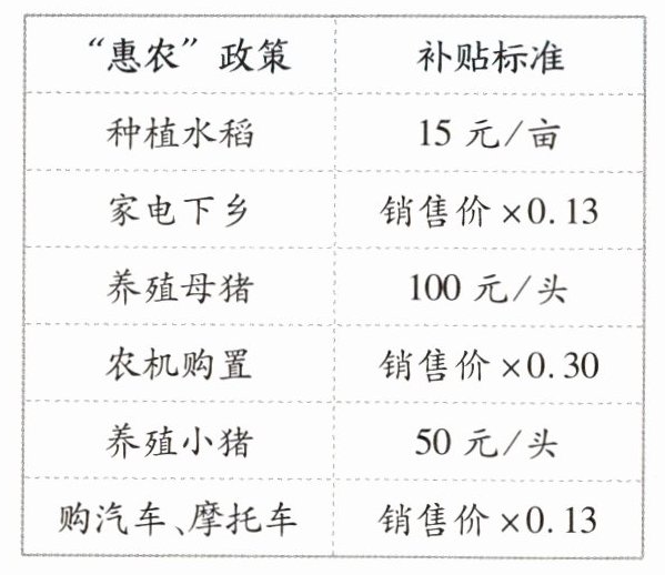 【点拨】水稻的种植面积×每亩水稻的补贴=种植水稻的补贴。家电下乡的补贴标准是销售价×0.13,则液晶电视的销售价×0.13=家电下乡的补贴,把两部分的补贴相加就是陆阿姨家得到的补贴。