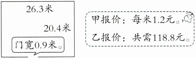 【点拨】根据长方形的周长=(长+宽)×2,计算出长方形空地的周长,再减去门宽,就是所需篱笆的长度。篱笆的长度乘1.2就是甲安装篱笆需要的费用,再与乙的报价进行比较即可。