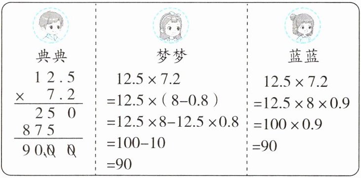 D [点拨]典典用的是竖式计算方法;梦梦把7.2看作8−0.8,运用乘法分配律进行计算;蓝蓝把7.2看作8×0.9进行计算。解法不同,结果相同,三人都正确。