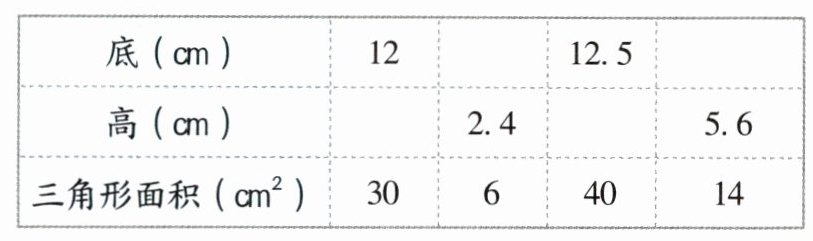 5;5;6.4; 5 【点拨】根据三角形的底=面积×2÷高,三角形的高=面积×2÷底计算。