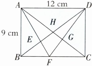 【点拨】要求涂色部分的面积,可以用长方形ABCD的面积减去三角形BDF和三角形AFC的面积,但此时四边形EFGH在两个三角形中被减了两次,所以要加上8cm²。由图可知,三角形BDF和三角形AFC的高相等,所以两个三角形的面积和 = (BF + CF)×AB÷2 = BC×AB÷2,即12×9÷2 = 54(cm²),那么涂色部分的面积就是12×9 - 54 + 8 = 62(cm²)。