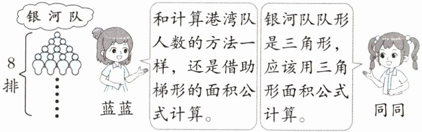 ③聪聪:队形图看起来像梯形,第一排人数相当于梯形的上底,最后一排人数相当于梯形的下底,排数相当于梯形的高。可以根据(首排人数 + 末排人数)×排数÷2来计算。