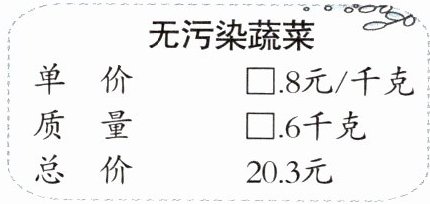 5. 新题型说理题 下面是同同妈妈买蔬菜的价钱表,单价和质量都显示不全,总价是四舍五入保留一位小数后得到的。你知道总价四舍五入前是多少吗?请说明理由。