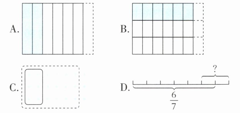 1. 新考法图示分析法 下图中不可以表示$\dfrac{6}{7}÷ 3$计算过程的是(