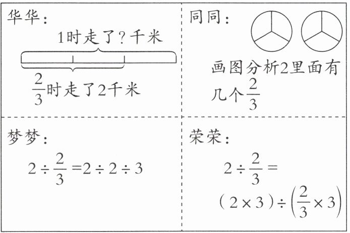 (1) 在学习分数除法时,四位同学用不同的方法探究$2÷\frac{2}{3}$, (