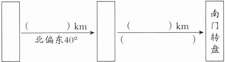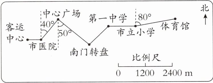 (3) 8 路车从体育馆返回客运中心,在中心广场沿着$( )( ) ^{\circ} 方向行驶( ) \mathrm{km} $到达市医院。(6 分)