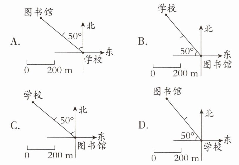 )表示图书馆在学校北偏西 $ 50^{\circ} $ 方向 $ 400 \mathrm{m} $ 处。