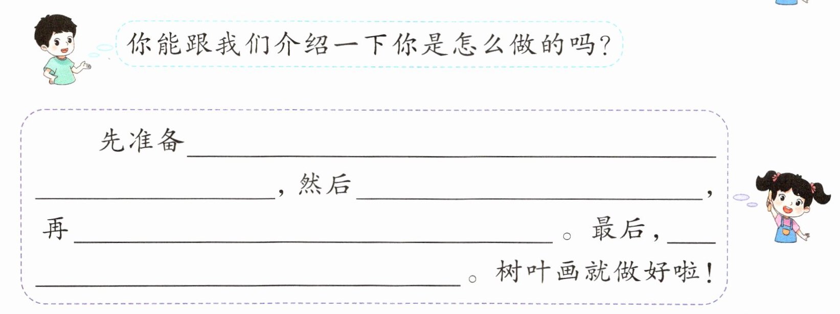 7.观察下面的树叶画,根据提示帮元元介绍一下怎么做树叶画吧!
