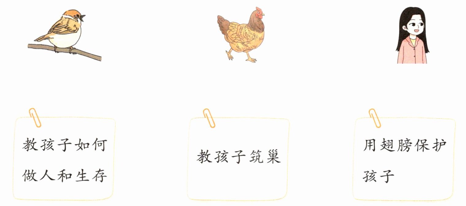 小麻雀说:“妈妈的爱是整天飞东飞西,衔来谷粒哺(bǔ)育我们,教会我们筑巢的本领。”