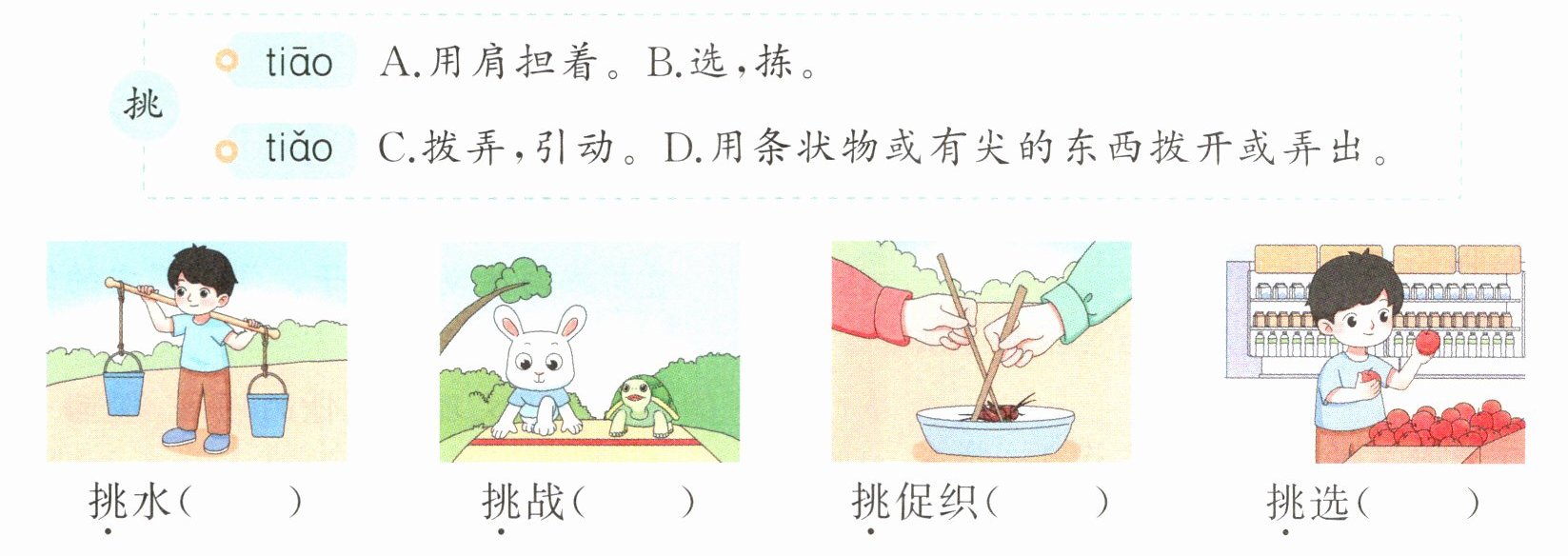三 新角度 根据多音字字义卡,结合图片的内容选择正确的义项。(填序号)