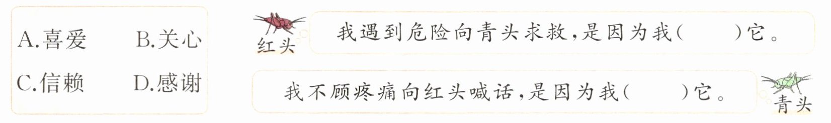 3. 体会红头和青头之间的友谊,选择恰当的词语把它们的对话补充完整。(填序号) C B
