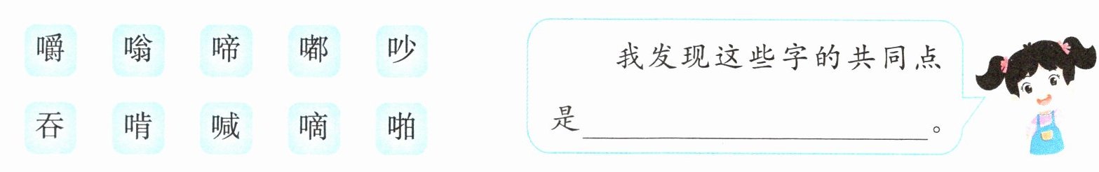 都含有“口” 1.嚼、吞、啃 示例:咬 2.嗡、嘟、嘀、啪 示例:吱 哗 3.啼、吵、喊 示例:叫 吼