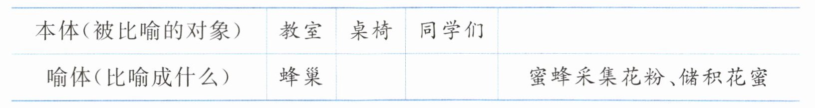 排列的桌椅,是一格一格的蜂房,井然有序。上课铃一响,你一格,我一格,大家坐好。在老师的传授中汲(jí)取,在各科的书籍里寻觅。时而循着历史的长河飞向遥远的古代,时而飞翔在当今的科学天地,时而书声琅琅,时而书写沙沙。在知识的大海里采撷(xié)、探索、积累,像金色的小蜜蜂在花海里采集花粉,嗡嗡嘤嘤地飞鸣、渴求。在各自的蜂房里忙碌地储积着蜜。