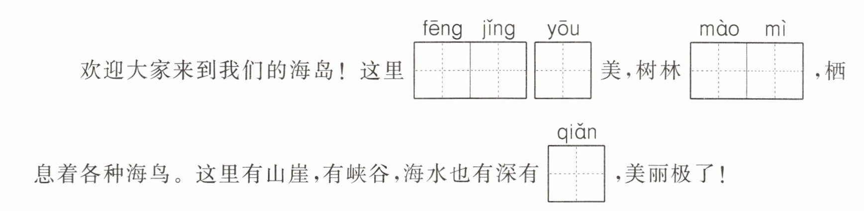 二 新情境 读一读菲菲写的“我为家乡代言”导游词片段,帮她补写完整。