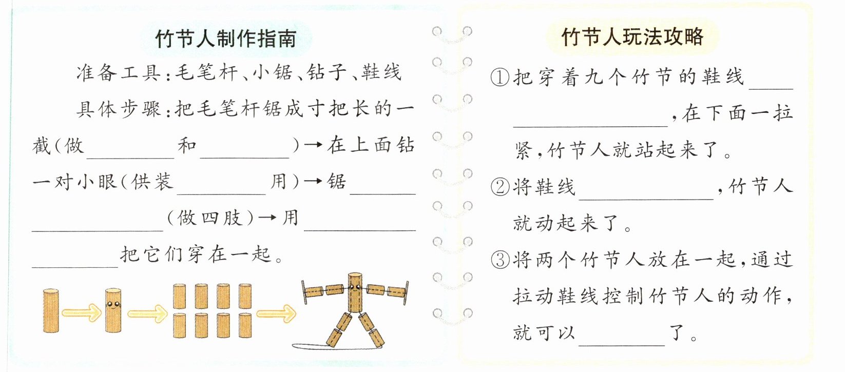 (3)脑袋 身躯 手臂 八截短的毛笔杆 一根鞋线 ①嵌入课桌裂缝里 ②一松一紧 ③搏斗 2.