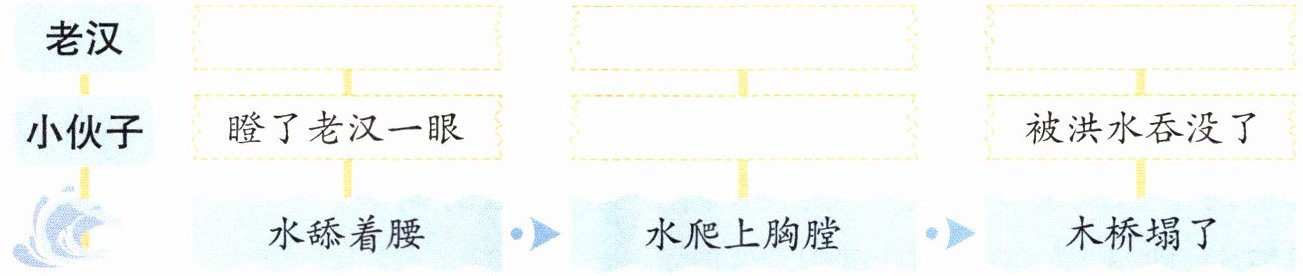 1.(从上往下)揪出小伙子 把小伙子推上木桥 也被洪水吞没了 推了老汉一把 2.动作 语言 冲 揪 吼 铁面无私、不徇私情 3.(从上往下)党员 人民群众 父亲 儿子 4.AC