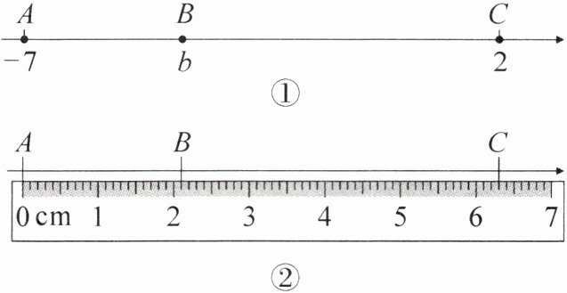 6. 如图①,$A$,$B$,$C$是数轴上从左到右排列的三个点,表示的数分别是$-7$,$b$,2.某同学将刻度尺按如图②所示的方式放置,使刻度尺上的数字0对齐数轴上的点$A$,发现点$B对齐刻度2.1\,cm$,点$C对齐刻度6.3\,cm$。