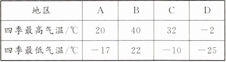 11. 新考向 情境题·植物栽培 某种植物成活的主要条件是所在地区的四季温差(最高气温与最低气温的差)不得超过 $20^{\circ}C$,若不考虑其他因素,下表中的四个地区中,适合大面积栽培这种植物的是(