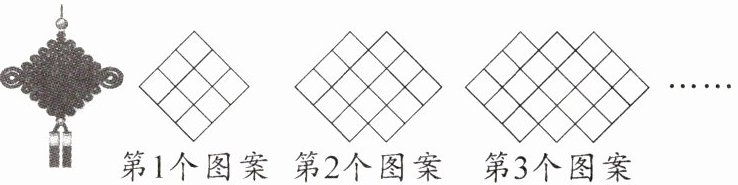 19. 新考向 传统文化·中国结 中国结寓意美满团圆,中间的图案均由小正方形按一定规律组成。如图,第1个图案中共有9个小正方形,第2个图案中共有14个小正方形……则第$n$个图案中小正方形的个数为