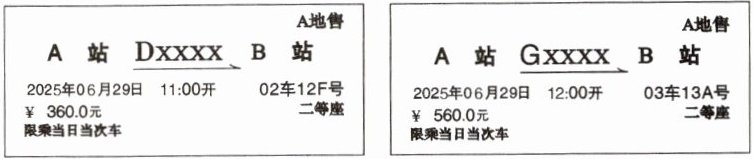 12. 新考向 情境题·火车票 如图是两张不同类型的火车票(“Dxxxx”表示动车,“Gxxxx”表示高铁)的部分信息: