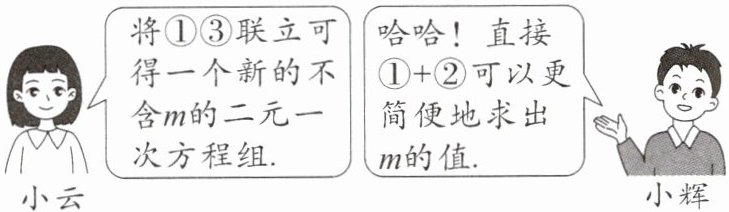 4. 数学活动课上,小云和小辉在讨论老师出示的一道有关二元一次方程组的问题:已知关于$x$,$y的二元一次方程组\begin{cases}3x + 4y = 3, &①\\x + 2y = 2 - 3m &②\end{cases} 的解满足2x + 3y = 1$③,求$m$的值。