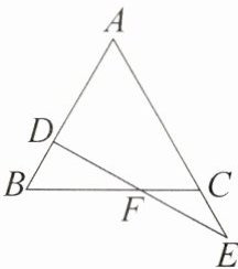 1. [一题多解]如图,在 $ \triangle ABC $ 中,$ AB = AC $,点 $ E $ 在边 $ AC $ 的延长线上,点 $ D $ 在边 $ AB $ 上,$ DE $ 交 $ BC $ 于点 $ F $,且 $ DF = EF $。求证:$ BD = CE $。