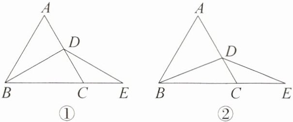 (1)如图①,当 $ D $ 是 $ AC $ 边的中点时,求证:$ DB = DE $。