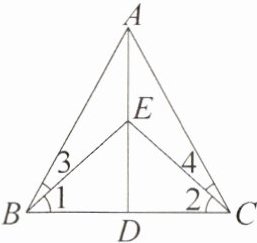 11. [教材 P143 习题 T10 变式题]如图,在 $ \triangle ABC $ 中,$ D $ 为 $ BC $ 上一点,连接 $ AD $,点 $ E $ 在 $ AD $ 上,且 $ \angle 1 = \angle 2 $,$ \angle 3 = \angle 4 $。求证:$ AD $ 垂直平分 $ BC $。