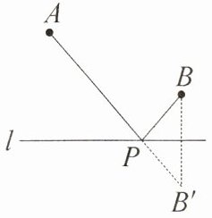 作法:如图,作点B关于直线l的对称点B',连接AB',与直线l的交点即为所求点P。因为PA+PB= PA+PB'≥AB'(两点之间,线段最短),所以PA+PB的最小值为AB'的长。