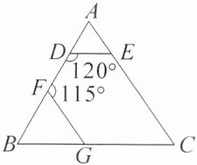 10. 如图,在$\triangle ABC$中,点$D$,$E$,$F$,$G都在\triangle ABC$的边上,$DE// BC$,$\angle BDE= 120^{\circ}$,$\angle DFG= 115^{\circ}$,求$\angle FGC$的度数。