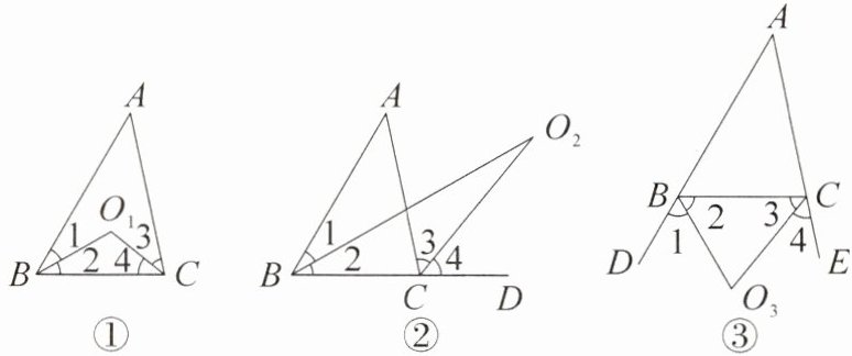 1. [2025·邵阳新邵县期中]图①②③中,∠A = 42°,∠1 = ∠2,∠3 = ∠4,则$∠O_1 + ∠O_2 + ∠O_3 $度数为(