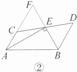 证法二(补短法):如图②,延长 $AC$ 至点 $F$,使 $AF = AB$,连接 $EF$。